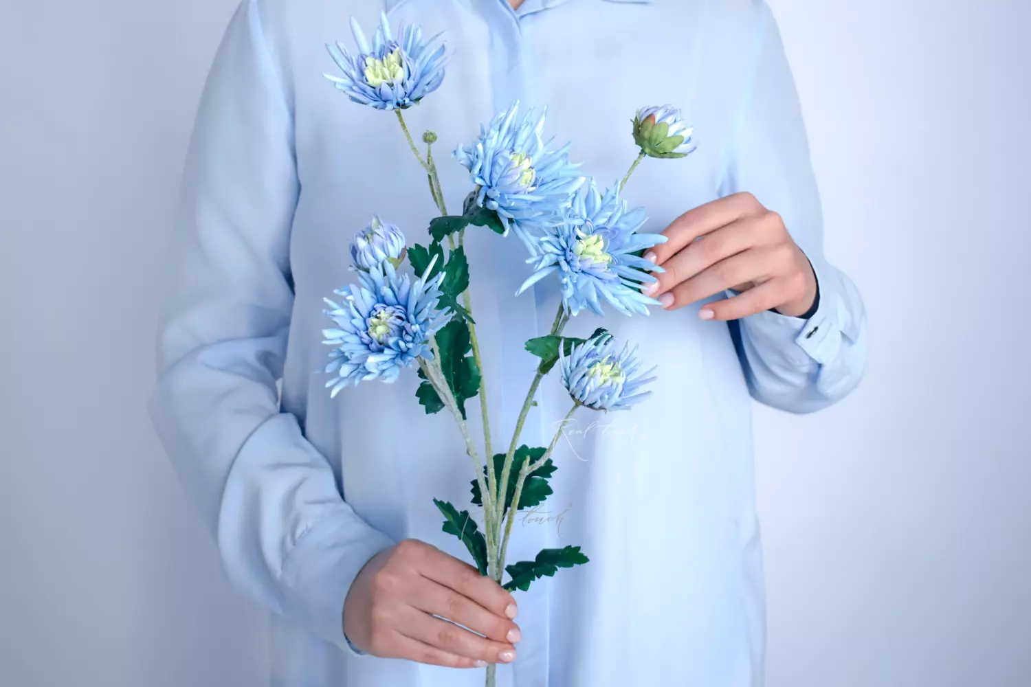 Это нежные игольчатые хризантемы с разноразмерными плотными бутончиками. Высота ветки с цветами – 76см, соцветия диаметром от 3см до 9см, лепестки в центре собраны в плотный шарик, будто вот-вот распустятся, количество бутонов – 7 (включая 2 небольших). Соцветия выполнены из шелка с латексным покрытием, а листочки из текстиля (листочки можно слегка отпаривать после транспортировки). Стебель цветка с легким белесым мягким напылением, имитирующем ворсистость, в основании стебля есть проволока, доходящая до крупных соцветий. Благодаря проволоке цветочную ветку можно расправить и придать нужный объем и задать направление. Нежный голубой цвет с желто-зеленой сердцевинкой делают хризантему более очаровательной и реалистичной. Такая хризантема сможет удивить и стать прекрасным дополнением многих цветочных композиций.