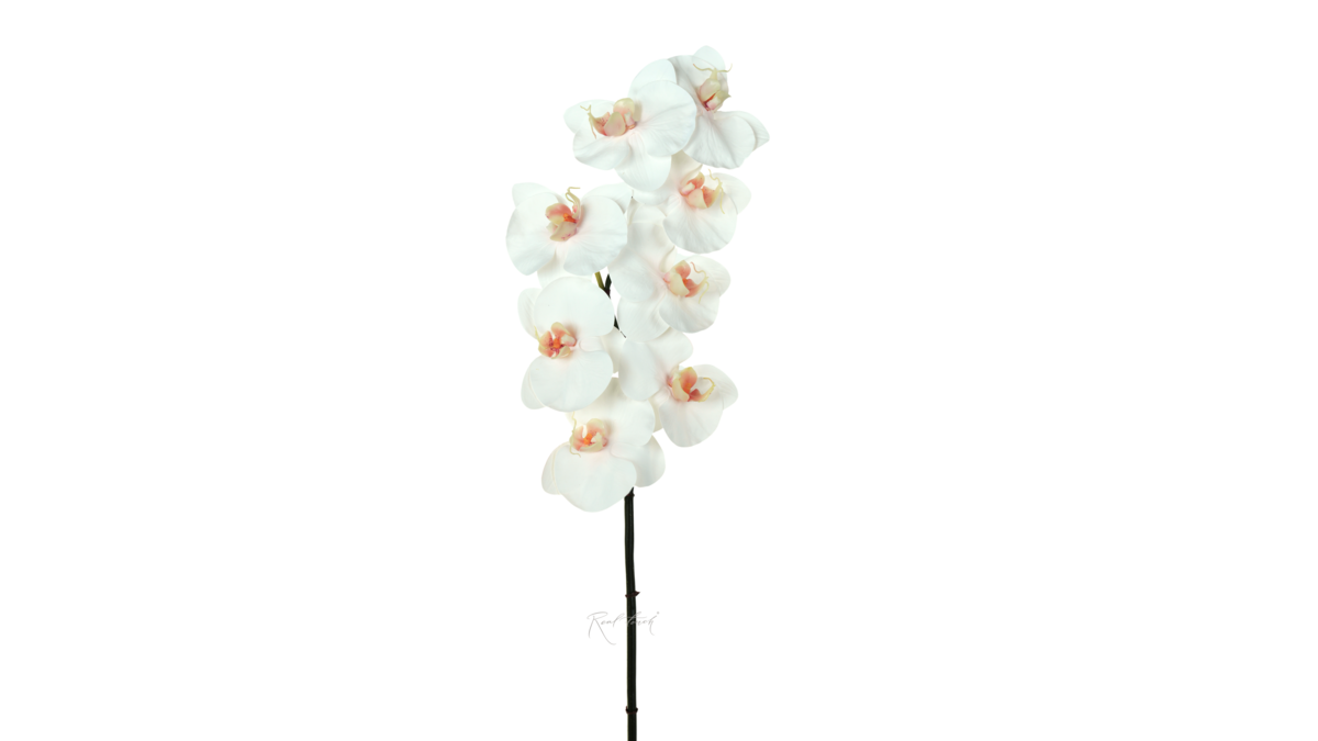 Новая орхидея Real Touch - это потрясающая ботаническая копия, отличительной особенностью которой является детальная проработка каждого цветка и очень приятная на ощупь, бархатистая, максимально приближенная к настоящему цветку по ощущениям, тактильная фактура лепестков. Лепестки выполнены из тонкого силикона, при этом существует формовка и, характерное для больших соцветий орхидей, ребро. Внутри соцветия сердцевина, выполненная из мягкого пластика с бело-желтым градиентом и реалистичным рисунком. Детальная зелено-коричневая печать с обратной стороны соцветий придает орхидее еще больше естественности.