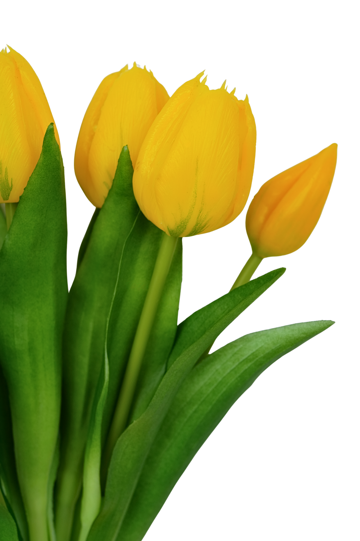 Листья тюльпанов также выполнены из плотного силикона, что придает им максимальную реалистичность как на ощупь, так и визуально. Также большую тактильность тюльпанам передают прожилки на листьях. Как и в природе, цвет листьев неоднородно зеленый, с плавным градиентом в светлые тона.